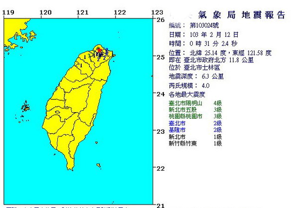 中国台湾网2月12日消息 据台湾“东森新闻”报道,12日凌晨零点31分发生的浅层地震,由于震央就在台北市区内,许多民众都被吓醒。有人说晃了将近1分钟,有人说只听到“碰”一声,接着上下摇晃几秒,还没开始恐惧就结束。由于震央就在士林区,离大屯火山区的阳明山非常接近,还有人怀疑“难道大屯火山活过来了吗?”