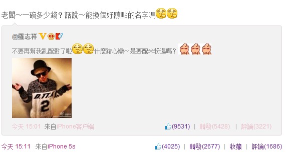 林心如也转贴小猪的贴文,并回应说,“老板,一碗多少钱?”“话说~能换个好听点的名字吗?”,搞笑看待绯闻。(中国台湾网 何建峰)
