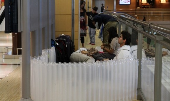 成田机场因大雪造成航班大乱,旅客利用气垫充当隔板入眠。(台媒图)