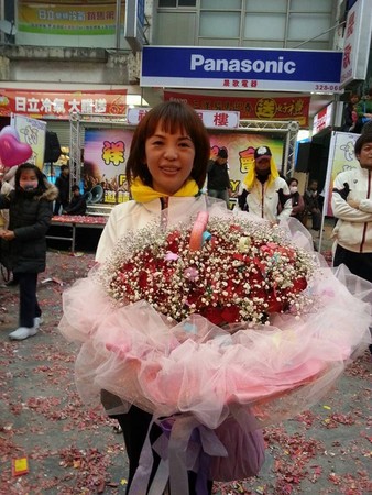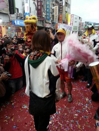 台东元宵节炮炸邯郸爷,今天出现不一样的肉身邯郸,手上的榕树叶换成一束粉红色玫瑰花,头上绑着“为爱而战”黄色布条,自信的挺身接受炮炸。