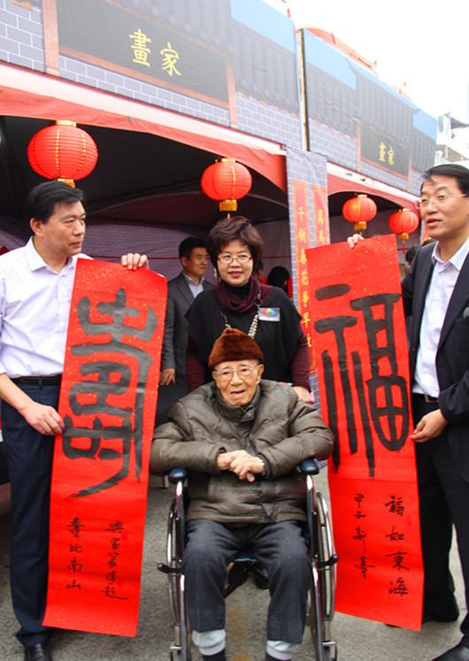 程茂全与张和平看到百岁老人亲临现场非常感动,书写“福如东海 寿比南山”送给老人家。。(中国台湾网 李婷婷 摄)