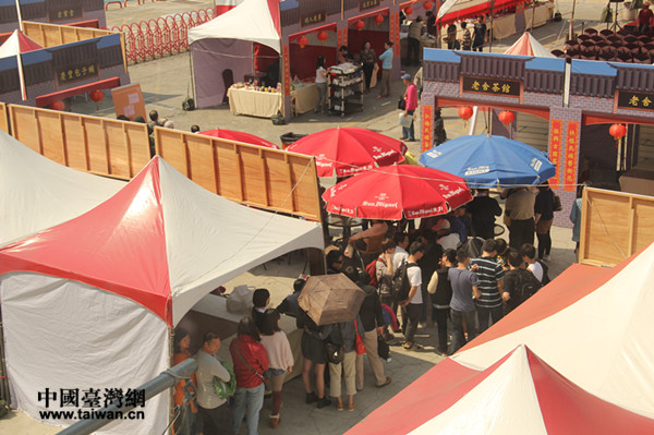 2月17日中午11时,距离撤展还有5个小时,老舍茶馆的茶叶、茶具及带有老舍茶馆字号的毛巾已于昨天销售完毕,已经提前撤展。庆丰包子依然火爆,仍有不少台湾民众在烈日下排队购买。(中国台湾网 李婷婷 摄)