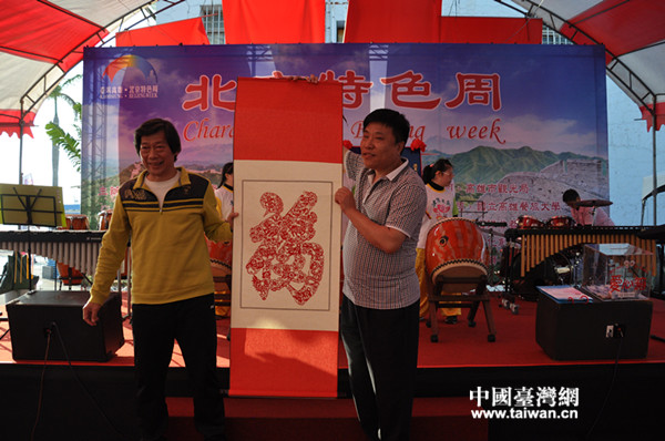 一位来自台湾的老师,每天都到拍卖现场参与拍卖并将拍得物品送给唐氏症关爱者协会的唐宝宝。北京市台商投资服务中心高克祥主任将徐阳剪纸的“福”字送给这位爱心老师。(中国台湾网 李婷婷 摄)