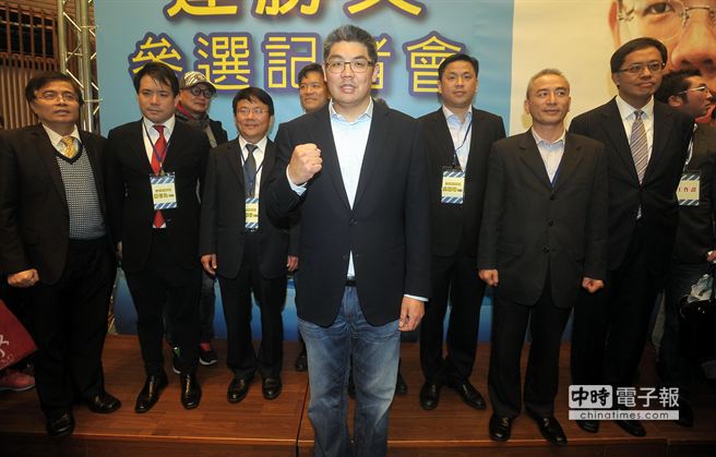 连胜文24日宣布参选台北市长,并且与他的市政顾问一起合影留念。(图片来自台媒)