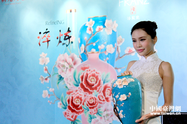 法蓝瓷24日在京推出“红楼梦”系列瓷品,图为诠释探春所抽杏花“名签”的瓷瓶——春晓(中国台湾网 李徽 摄)