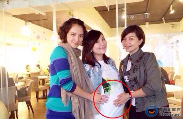 梁静茹(中)的孕肚大被怀疑怀双胞胎。(图片来自台媒)