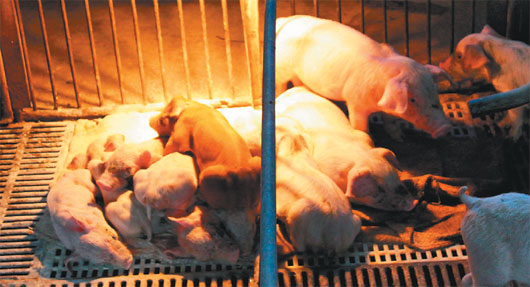 记者镜头下感染腹泻的仔猪(左)与正常仔猪(右)相比明显羸弱。台湾联合报提供