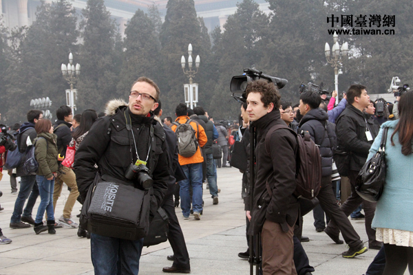 这两位外国记者对身边的热闹表现的很淡定。(中国台湾网 王怡然 摄)