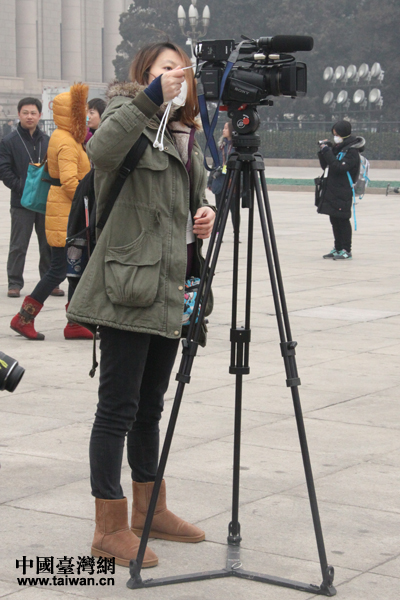 记者调试摄影机器,在广场等候采访全国政协委员。(中国台湾网 张洁 摄)