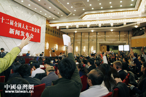 十二届全国人大二次会议今日在人民大会堂举行新闻发布会,与会媒体争相提问。(中国台湾网 王思羽 摄)