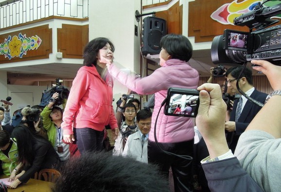民进党“立委”叶宜津、国民党“立委”杨琼璎跳上桌子为登记发言顺序大吵。(台媒图)