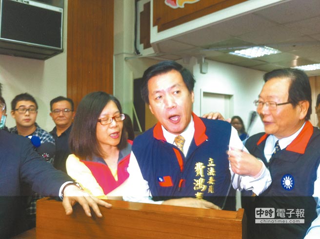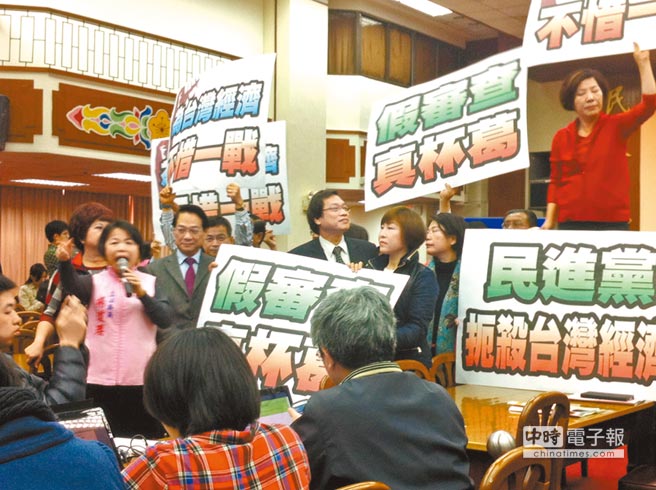 《服贸协议》初审第1天,蓝绿阵营一早便因登记发言问题爆发口角,双方在会场互相叫嚣,蓝营批绿营“假审查,真杯葛”。(图片来源:台湾中时电子报)