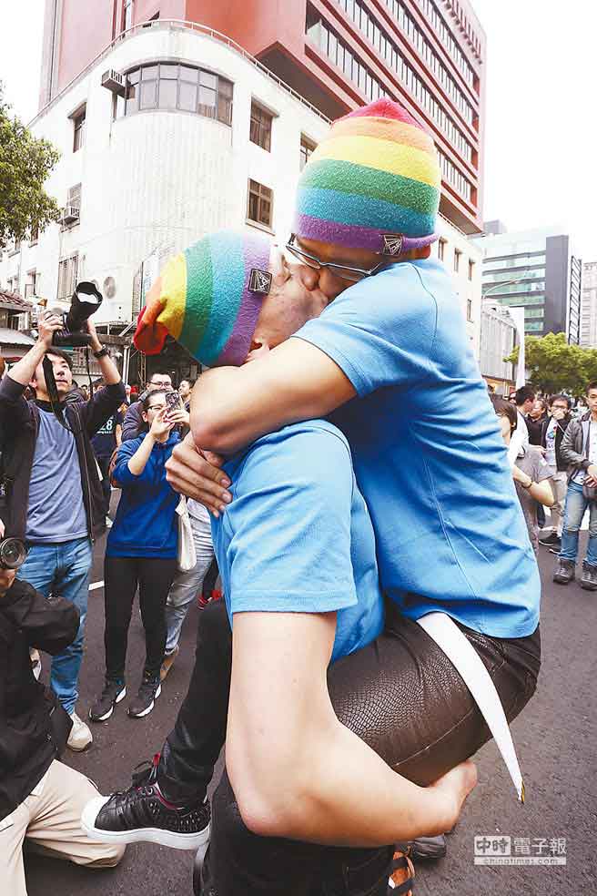相对的,台湾“伴侣权益推动联盟”等团体16日上午在“立法院”旁举办“全民街吻”活动,号召数十对同志爱侣以接吻的方式表达对彼此的爱,场面热烈。