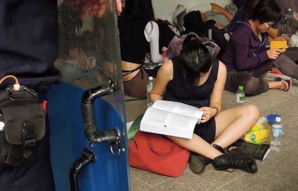 反服贸女学生警盾前就地温书。(台媒图)