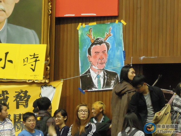 学生持续占领“立法院”议场,有学生画“鹿茸像”讽马英九。(图片来自台媒)