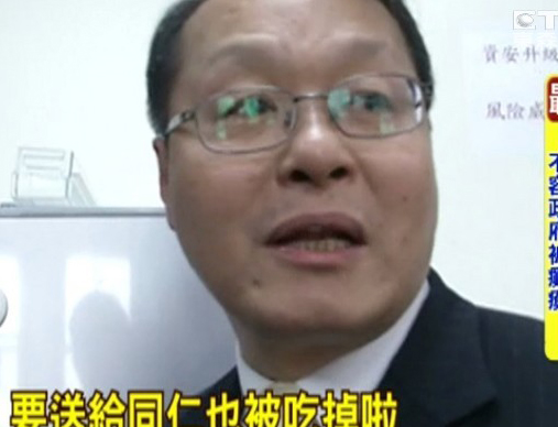 “行政院副秘书长”萧家淇清点损失,发现有人偷喝他的饮料、偷吃他的太阳饼,不禁向媒体记者抱怨连连。(图片来自台媒)