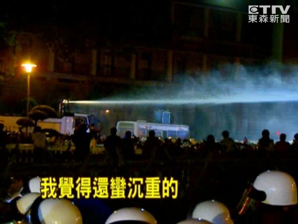 2008台北市警局曾出动水车驱离群众,平常备而不用的水车,6年后再次派上用场,却是张姓警察最不乐见的。一方面遭受攻击,一方面必须要执行勤务,面对失控的场面,他坦承当下心情很复杂,从警22年,曾经在2000年“大选”后的抗议行动中执行过任务,没想到13年后值勤,会再次坐上水车驾驶座。他表示,“大家都没有拍到的,攻击警察,甚至到最后有人拿镭射枪,一直在照我的眼睛,我觉得还蛮沉重的。”