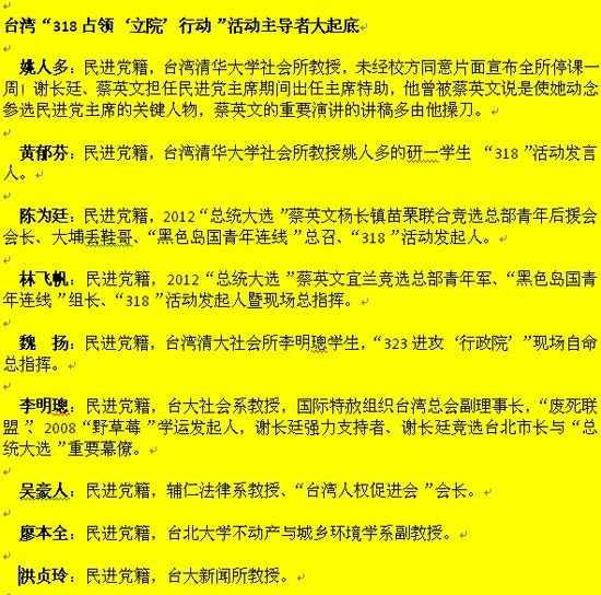 中国台湾网3月28日消息 近日,来自台北的学生简俊义在网络上发文曝光了318参与学运的主要学生名单及简历。记者从公布的23名主导者信息中留意到,竟有22名为民进党籍,两名是所谓的“反中”激进派成员。这让人很难不与民进党的政治诉求联系起来。简俊义更在文中自嘲:“教授与学生身份真好用!请跟我说这是不是政党操弄。”