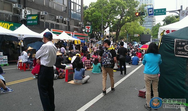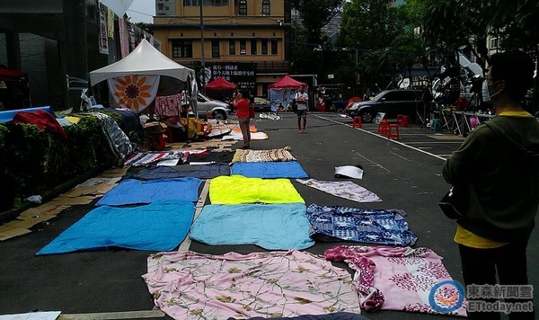 昨日,学生及民众集结凯道反服贸,人潮从凯道蔓延至中山南路、济南路、青岛东路,反服贸学生团体总指挥林飞帆30日晚间号召大家排班守“立法院”,不过31日下午议场外群众人数减少,“立法院”青岛东路侧停车场成为“晒被场”。