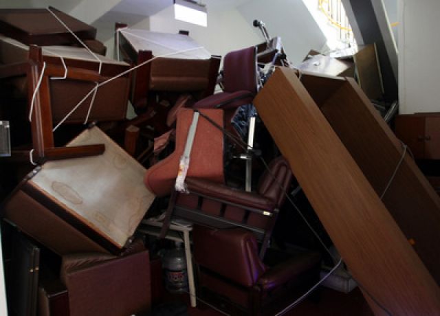 反服贸学生在3月18日冲入“立法院”霸占议场,并“就地取材”,以议场内的椅子等物品筑成“防御工事”,阻挡警察进入,学生20多天来的占领行动,也造成议场内设备、物品严重毁损。