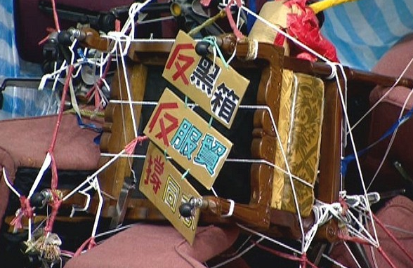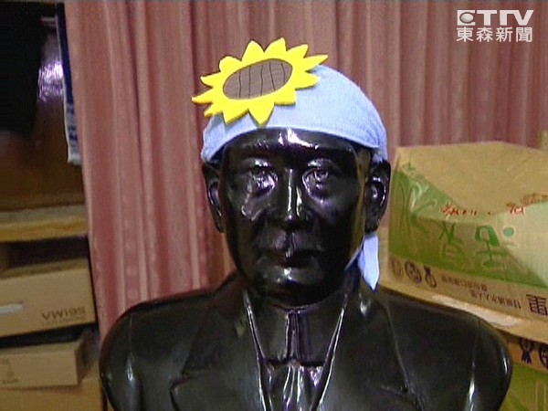 “立法院”议场“院长”的龙椅,原本的位置在正中央的主席台,现在堵在5号门口,与其它委员的办公椅绑在一起,被倒着放。中山铜像被搬到二楼廊道的桌子上,下头摆着一整排的资源回收,看起来像是慰劳中山看管的辛苦,学生还应景地在中山的头上绑了一条毛巾。