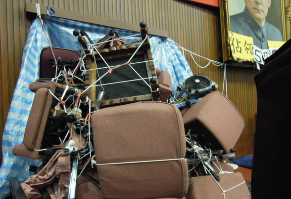 学生防御警察闯入的椅子墙,图中木椅应为“院长”座椅。(台媒图)