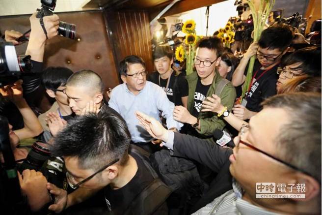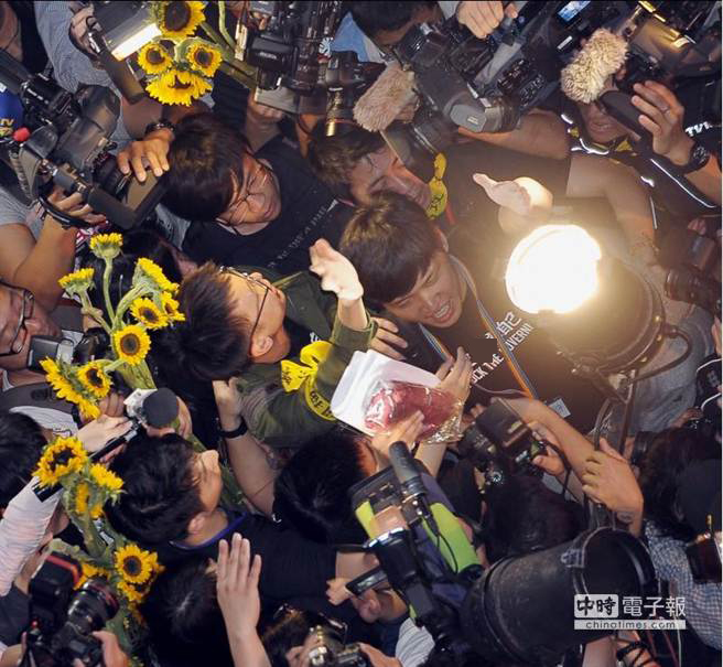 10日傍晚林飞帆(中)与同学们一起步出议场、离开“立法院”。(图片来自台媒)