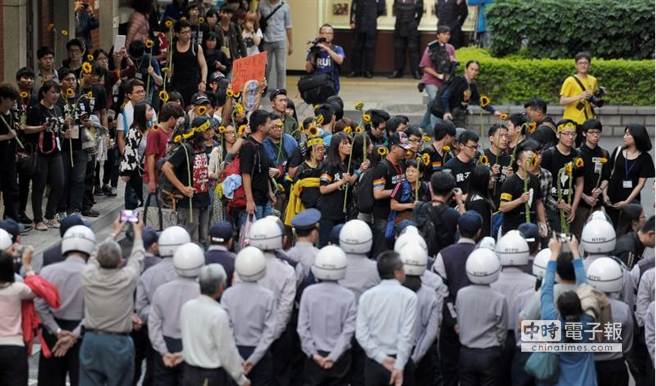 占领“立法院”议场的学生10日傍晚在发表声明后,人手一枝太阳花,在警力的戒备下步出议场。(图片来自台媒)