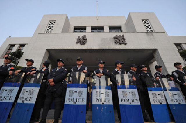 10日,警察收复“立法院”后在“立法院”议场外警戒,固守刚收复的议场。(图片来自台媒)