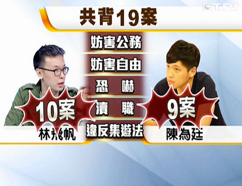 学生退出立法院后,警方立刻接管进驻搜证,台北检方统计,到4月10日为止,整个反服贸运动相关案件总共分案受理25案,其中林飞帆和陈为廷就涉嫌刑法妨害公务、妨害自由、恐吓、渎职以及违反集游法等罪嫌,林飞帆被告发10个案件,陈为廷也有9个,2人身上共背19案。