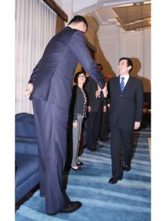 中国台湾网4月11日消息 台湾地区领导人马英九今天接见国际特奥委会贵宾时,与身高2.26米的国际特奥会形象大使姚明见面握手。马英九特别抬起头来,姚明则稍微弯下腰,画面生动有趣。