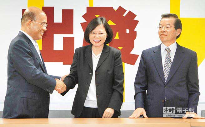 经过“太阳花学运”,苏贞昌、谢长廷14日先后宣布退选民进党主席,蔡英文可望重任党魁。图为2011年蔡英文宣布由苏、谢分别担任竞选总部主任委员、总指挥职务。(台湾中时电子报图片)