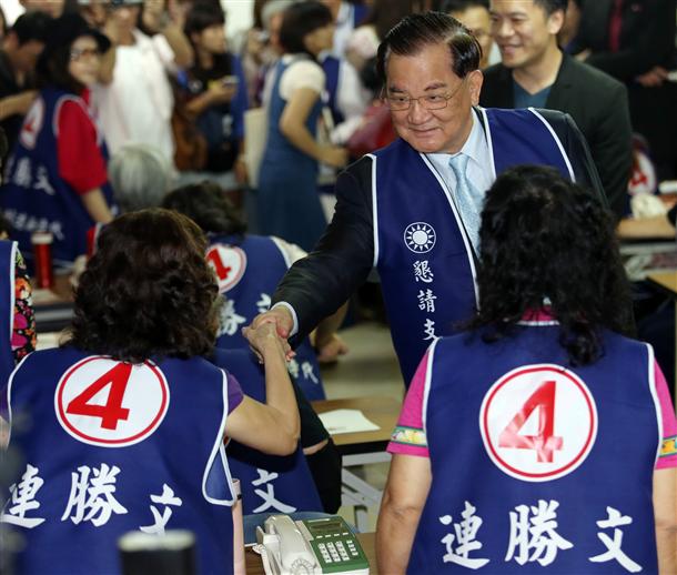 连战表示,看到志工妈妈们每天只睡4、5个小时,就积极来帮忙打电话,令他非常感动,所以今天专程来当面感谢大家,希望助胜文一臂之力。