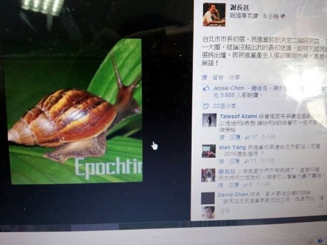 民进党台北市长整合速度,谢长廷贴“蜗牛照”叹无语(图片为翻摄自谢长廷脸书,来自台媒)