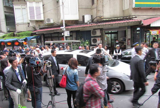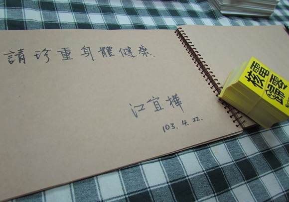 江宜桦大约停留10分钟左右,表情严肃、不发一语,在抗议群众的怒喊声中离去。