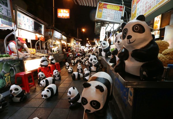 20家平均超过50年历史的摊商小吃宴请纸熊猫及纸黑熊吃宁夏夜市小吃。(图片来自台媒)
