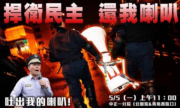 中国台湾网5月5日消息 据台湾媒体报道,反核民众指控台北警方拿走声援用的2个喇叭和1个行动式音箱,号召5日上午11时到中正一分局要分局长方仰宁“还我喇叭”。台大哲学系大五生洪崇晏也在facebook发文表示会到场力挺,呼吁网友一起到中正一局。