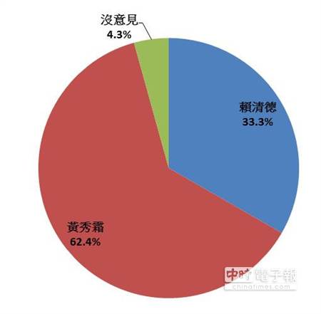 根据台湾中时电子报于5月4日下午4时至5月5日上午8时进行的最新online网络投票显示,黄秀霜有62.4%的支持率。赖清德有33.3%的支持率,较前日上升。有4.3%的投票率表示没有意见,黄秀霜的网络投票支持度一路领先现任市长赖清德,蓝绿双方持续对决中。(中国台湾网 李学磊)