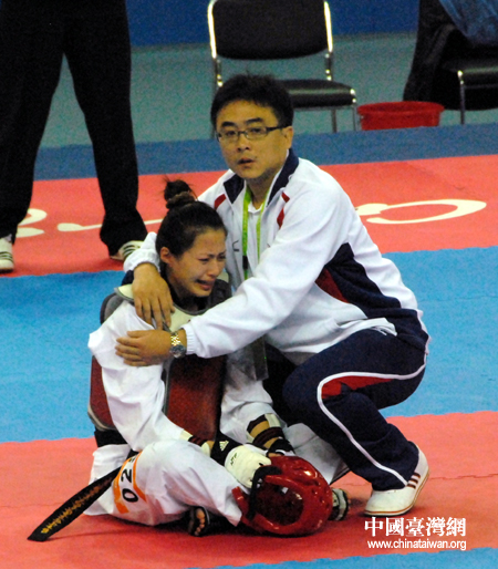 2010年11月17日,广州亚运会跆拳道比赛,女子49公斤级夺冠大热门中华台北队杨淑君由于比赛脚部感应器不符大赛规格,被取消比赛资格。图为杨淑君坐在场地中央失声痛哭。(中国台湾网资料图)