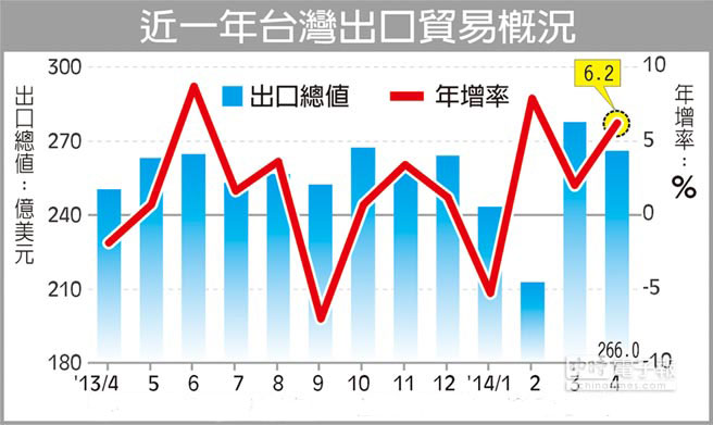 2013年4月至2014年4月,台湾地区出口贸易概况。(图片来源:台湾中时电子报)