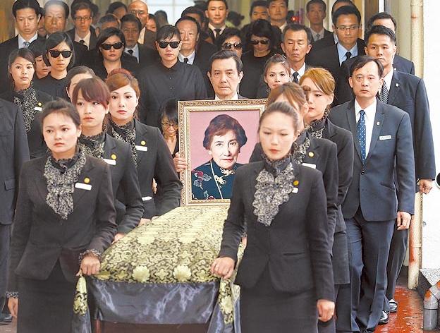 马英九手捧母亲遗照,伴着棺木,前往火葬场。(图片来自台媒)