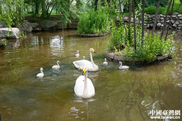 中国台湾网5月14日北京消息 5月14日上午,中国野生动物保护协会总工程师宋慧刚、国家环保部生态评估专家王增年教授在紫玉山庄总经理黄紫玉的陪同下,共同参观紫玉山庄,并详细了解了在这里刚孵化出来的六只白天鹅。此次在北京孵化的白天鹅是华北首次实现白天鹅放养状态下的自然繁殖。