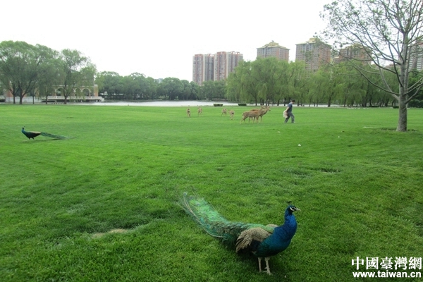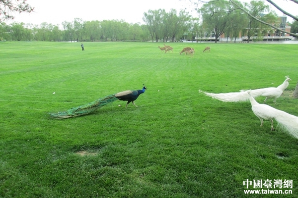 自由自在的孔雀与梅花鹿(中国台湾网 宣玲玲 摄)