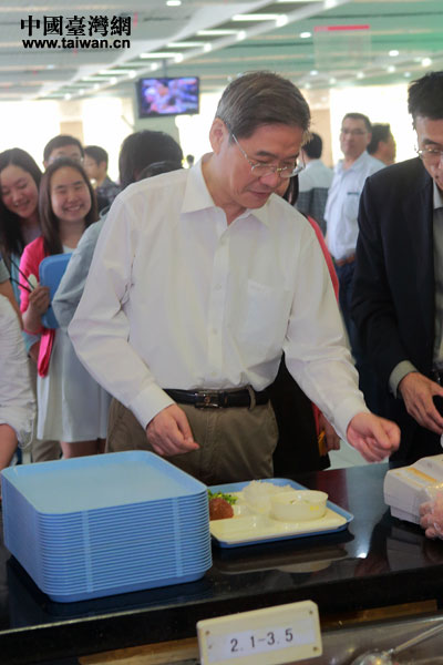 张志军与台湾学生一同排队打饭。(中国台湾网 于斯文 摄)