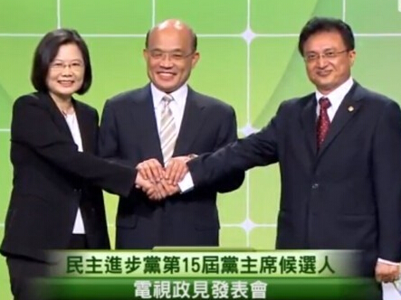 民进党主席候选人蔡英文、郭泰麟与现任党主席苏贞昌合照。(台媒图)
