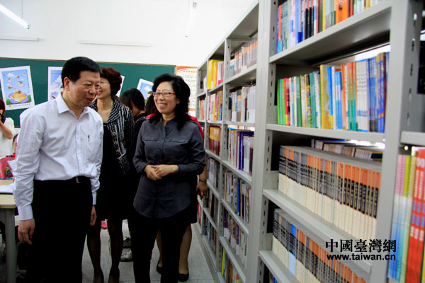 顶新国际集团董事长特别助理王兴华在图书馆参观,了解孩子们的读物配备情况(中国台湾网 李徽 摄)