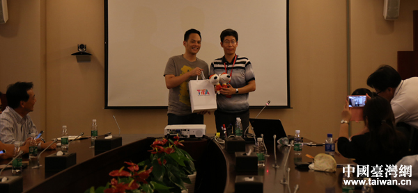 第七届两岸互联网发展论坛台湾嘉宾代表、之初创投共同创办人林之晨与京东负责人互换礼物。(中国台湾网 王怡然 摄)