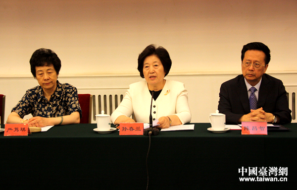 中国台湾网9月21日北京讯(记者 杨永青)中国和平统一促进会九届一次常务理事会议21日在京召开。中共中央政治局委员、中央统战部部长、中国和平统一促进会执行副会长孙春兰强调,要高举爱国主义伟大旗帜,广泛团结海内外各界人士,开创中国和平统一促进会工作新局面,为两岸关系和平发展和实现中华民族伟大复兴中国梦作出新贡献。