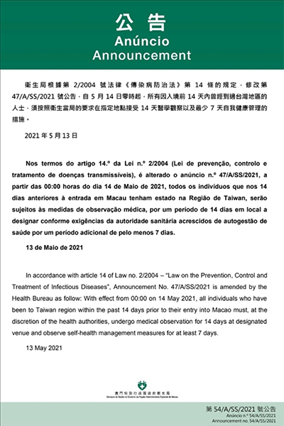 中国台湾网5月14日讯 据澳门特别行政区官网消息,澳门特别行政区新型冠状病毒感染应变协调中心13日下午宣布,因应台湾地区的疫情变化,澳门卫生局根据相关规定,自2021年5月14日零时起,所有因入境前14天内曾经到过台湾地区的人士,须按照卫生当局的要求,在指定地点接受14天医学观察以及最少7天自我健康管理,自我健康管理期间人士的澳门健康码会转为黄色。