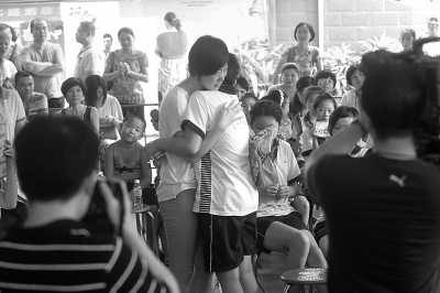 看到妈妈的真情流露,五年级的儿子站起来,红着眼睛对妈妈说:“我理解妈妈的心思,我会把英语学好的。”随后,母子二人流着泪拥抱在了一起,原本嘈杂的现场也因这一幕突然安静了下来。